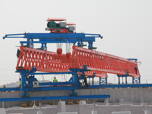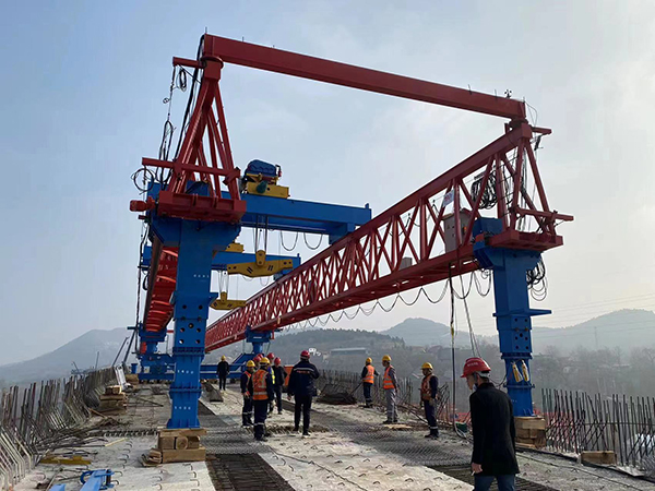 雙梁式架橋機 紅旗型架橋機和燎原型架橋機屬此類,吊重也是130噸。其吊臂是由左右兩條箱梁組成,兩梁貫通機身并向前后端伸出。在兩端都有各由兩腿桿組成的折疊立柱。紅旗型兩梁的中距為3.4米,燎原型的則為4.8米。橫跨兩條箱梁有兩臺桁車,能沿吊臂縱向行駛。吊梁小車置于桁車上,能沿桁車橫向行駛。待架的梁片(或整梁)可用鐵路平板車直接送到架橋機的后臂之下,用吊梁小車起吊后,憑桁車前移,再以吊梁小車橫移,然后落梁就位。這類架橋機的前后端都可吊梁及落梁;改變架梁方向時,不需要調頭;為適應曲線架梁,前后臂都可在水平面內擺動;分片架設時不必移梁或撥道,梁即可就位;"喂梁"也不需要橋頭岔線或特制運梁車。