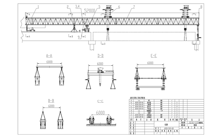 架梁之后要立即鋪軌,架橋機才能繼續向前作業。后兩種架橋機一般都能將預先組裝好的軌排吊裝就位,使架梁工作不致因鋪軌而造成延誤。 除上述常備架橋機外,施工單位有時根據需要制作各種臨時性架橋機。如在九江橋南岸引橋施工中,曾制成一臺可吊重300噸的專用架橋機,以整孔架設跨度40米的無碴無枕預應力混凝土梁。有的施工單位還常用常備鋼腳手桿件、拆裝式梁或軍用梁等組成簡易架橋機,及時完成架橋任務。技術參數: