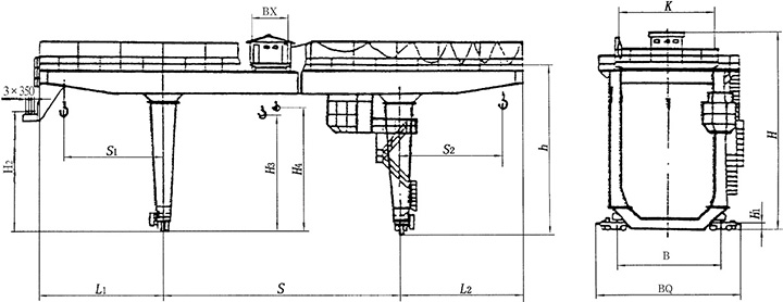 4.小車上設有液壓翻轉機構,該機構由液壓工作站和翻渣鉤組成。當掛梁起吊渣斗上升前,司機控制液壓翻轉機構動作,由液壓缸推動翻渣鉤后退到特定位置,然后渣斗起升翻渣吊鉤上方,司機控制翻渣鉤前進渣斗下,渣斗下降,兩側的偏心翻轉軸落在翻渣鉤上,繼續下降,渣斗利用自重偏心開始翻轉,進而完成傾倒工作。為滿足地鐵施工工期短、施工地點更換較頻繁的特點,我公司有針對性的在主梁上增設了變跨功能,以便于施工地點更換后跨度隨之變化。比如跨距在20-27米之間連續變跨。